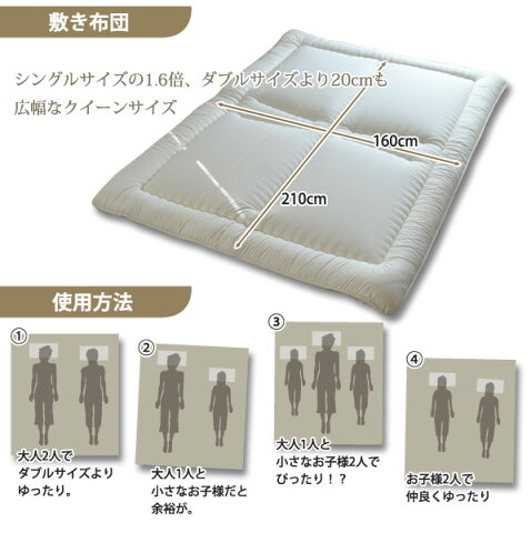 【キャッシュレスポイント還元】 セット内容 点数 サイズ 中身/生地素材 掛け布団1約210×210cm(約2.2kg)ポリエステル100%(帝人マイティトップ2 50%)、綿100%(200本ブロード)敷き布団1約160×210cm(約5.5kg)芯:ポリエステル硬わた、中わた:ポリエステル100%(帝人マイティトップ2 50%)、綿100%(200本ブロード)枕2約43×63cmポリエステル100%、綿100%(200本ブロード)製造国 日本製(国産) 配送送料無料となりますが、北海道および九州のお届け先のお客様は税込1,000円の差額運賃、沖縄・離島のお客様は別途追加料金が発生します。